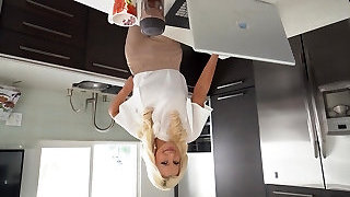 Magnificent busty ash-blonde housewife kneels down to suck delicious cock dry