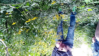 Milf with a big fat abdomen in tights masturbates in nature