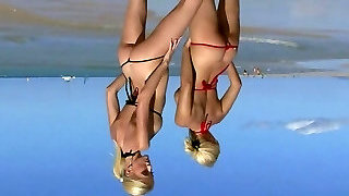 2弯曲的美女得到录音从后面同时穿着泳衣