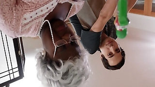 娇小的黑檀木的女仆抱怨后被支付被使用的平均白色的大鸡巴