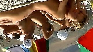 令人惊叹的金发女郎在裸体海滩上享受日光浴