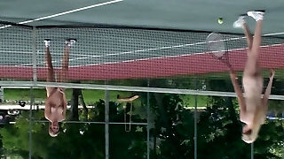 亚洲女孩与大奶终于得到打高尔夫球赤裸裸的
